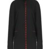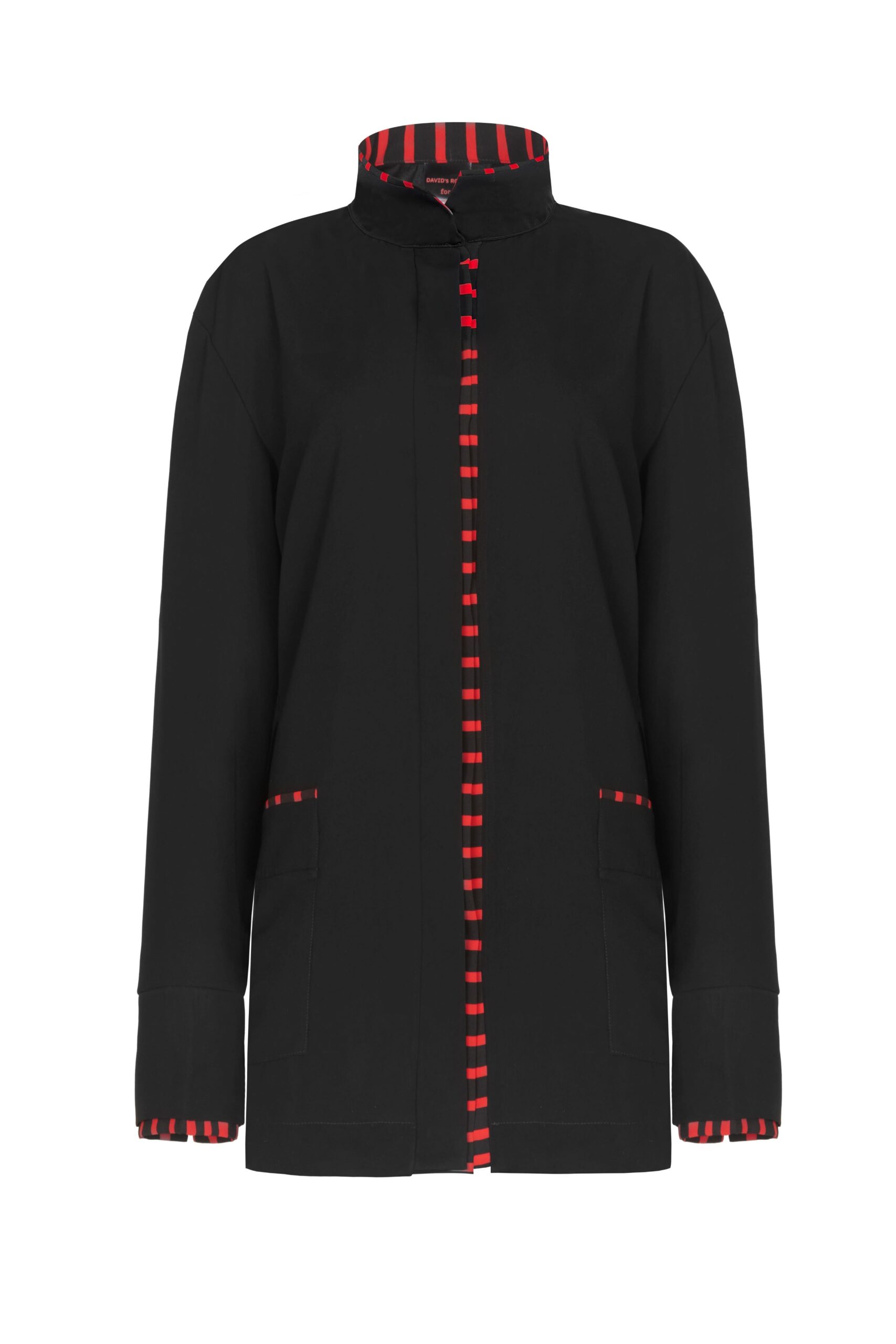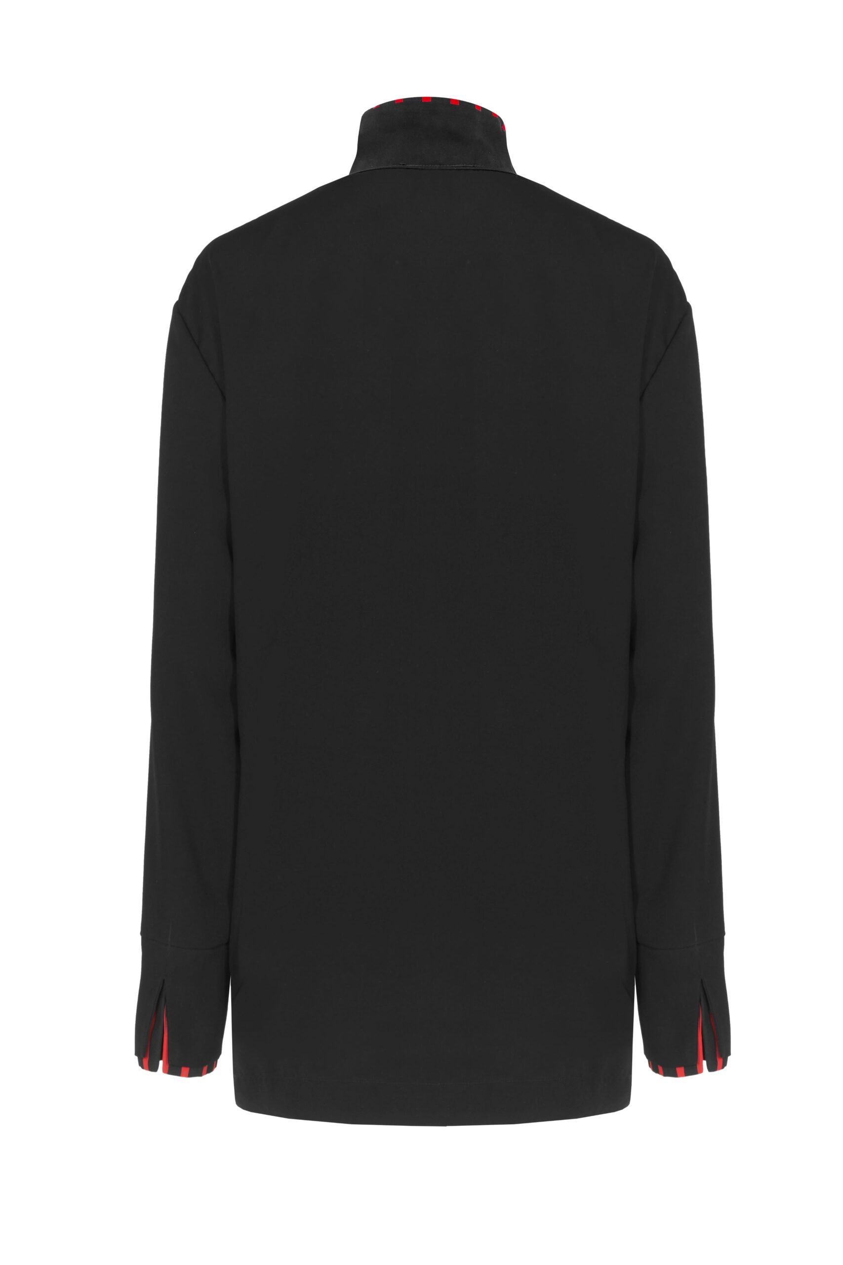 შავი, თავისუფალი სილუეტის პერანგი სტრუქტურული საყელოთი და დაფარული წინა შესაკრავით. დიზაინი გამორჩეულია სუფთა ხაზებითა და ფუნქციური ჯიბეებით.
