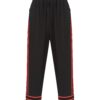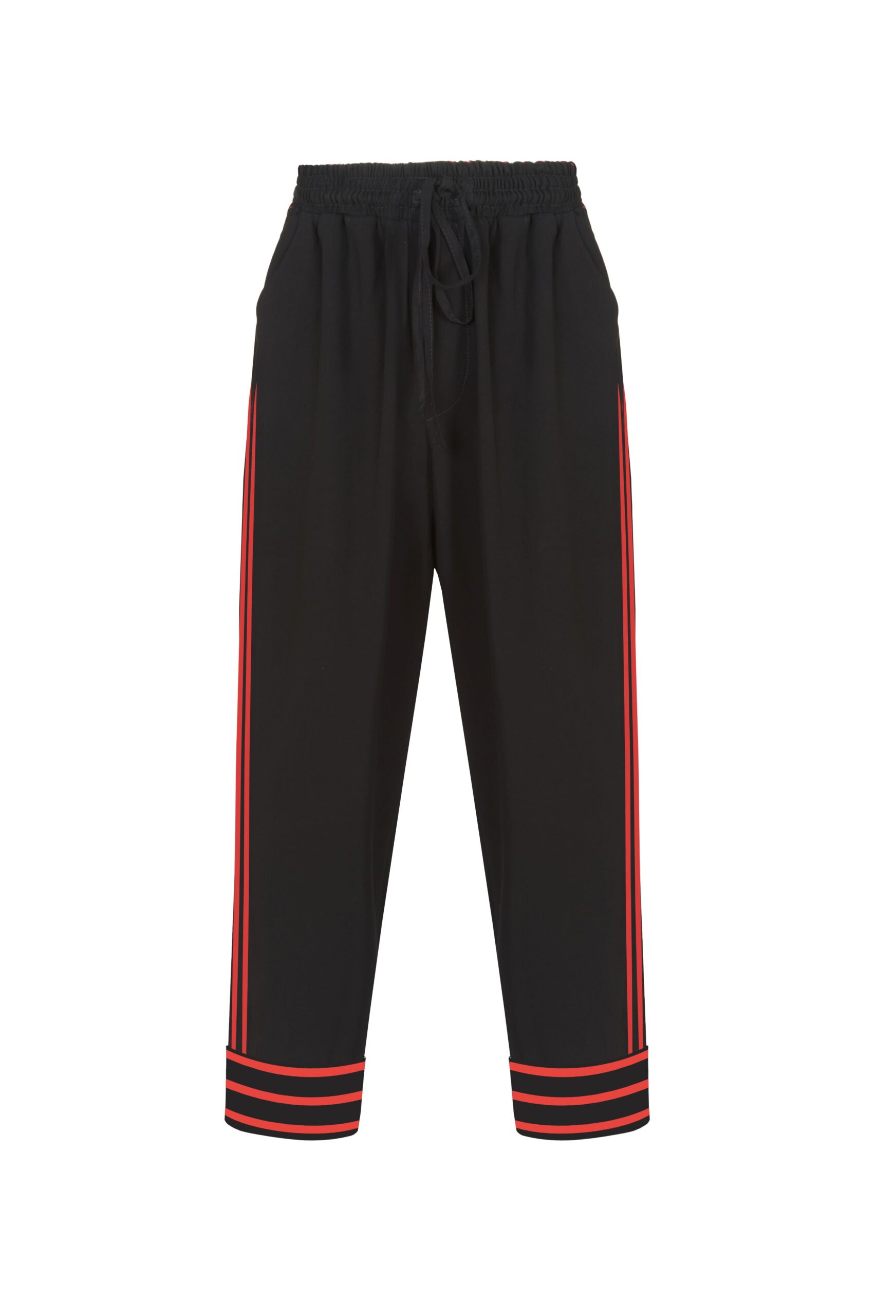 შავი, თავისუფალი სილუეტის შარვალი რეზინიანი წელით და მოსაჭერით. დიზაინი გამორჩეულია გვერდითი კონტრასტული დეტალებითა და იდეალურია ყოველდღიური კომფორტისთვის და სტილისთვის.