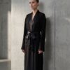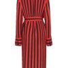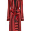 წითელ-შავი ზოლიანი ხალათი თავისუფალი სილუეტით. მოდელი წარმოდგენილია ფართო საყელოთი, ქამრით და დეკორატიული თასმებით.