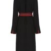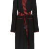 შავი ხალათი თავისუფალი სილუეტით, წითელი ზოლიანი კონტრასტული დეტალებით. მოდელი წარმოდგენილია ფართო საყელოთი, ქამრით და ჯიბეებით.